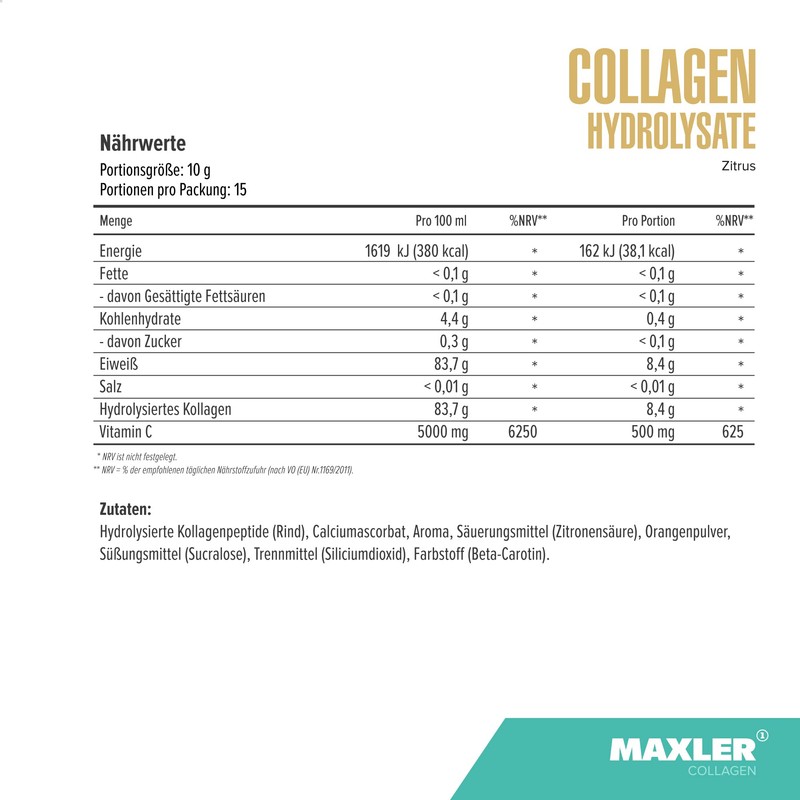Maxler Collagen Hydrolysate - Citrus - 150 g - Bovine Collagen - Enriched with Vitamin C for Better Absorption - Pure Collagen Peptides - 15 Collagen Powder Portions
