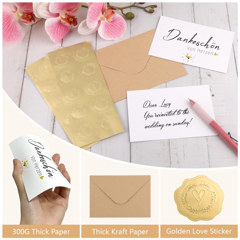 - HIGH QUALITY PAPER The thank you card is made of 300gsm thick cardboard, which is comfortable to the touch, allows smooth writing and does not penetrate. The robust kraft envelopes provide effective protection of cards