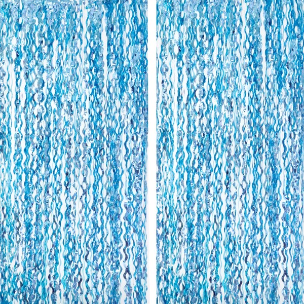 Maxqzin 2Pack Foil Fringe Curtains Tinsel Curtain Backdrop Wavy Blue Backdrop Curtain Wavy Foil Fringe Backdrop Curtain for Birthday Party Decor Ocean Party Decor Graduation Pool Beach Party Decor