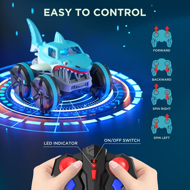 - ✅Crazy RC Stunt Car - Features on 360-degree rotation on dual-sides, race to drift and flip the rc cars all-around as you like. Easy to control for kids to operate this shark stunt car. Bring lots of fun to your kids.