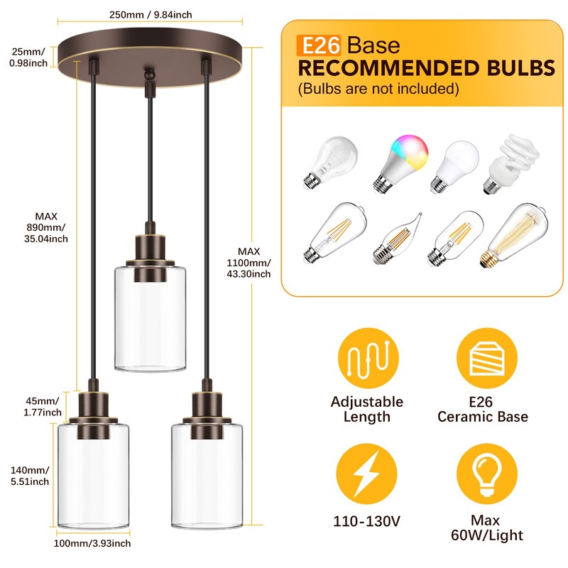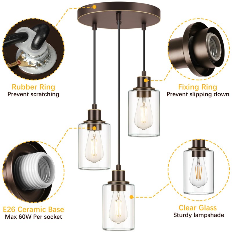 - Adjustable Height & Modern Design: The pendant light's three adjustable cables let you set the height up to 34.45 inches. With a oil-rubbed bronze finish and clear glass shade, it combines modern and classic styles, adding a touch of brilliance to any space.