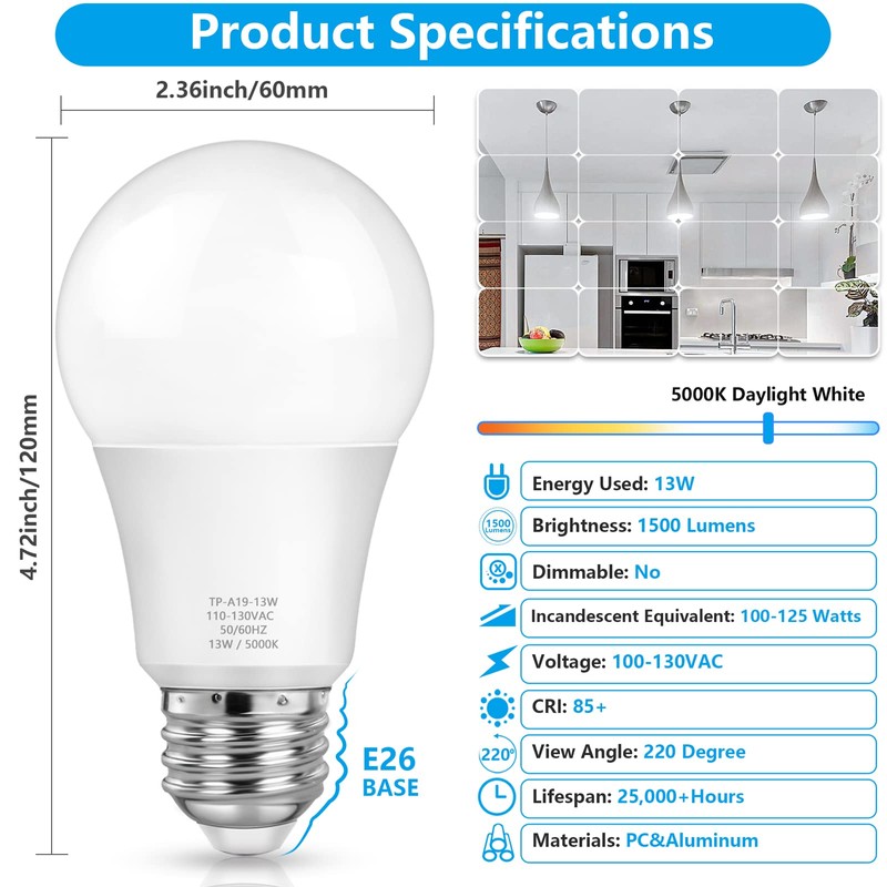 - Save Energy & Money: Replace 100-125w incandescent light bulbs with 13W LED light bulbs, based on 3 hours use per day, the A19 LED bulb will save up to 90% on the electric bill of lighting. More energy efficiency, but less heat output.