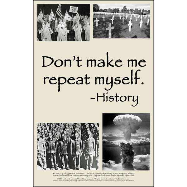 This poster depicts concrete examples of the kind of human-created tragedies that have repeated far too often in history. It's a stark reminder of why we need to learn from the past. It’s an immediate and effective response to the student who asks, "Why do we need to learn this stuff?" This poster makes an excellent companion to our larger "Recurring Dynamics of History" poster that lists 22 of the most important historical patterns that have repeated many times in history, and are likely to repeat again—unless we can remember and learn from our past. Also available is a 2-poster set that includes both of these fundamental history posters. For more information click the Maxwell Learning Store link near the top of this page, or visit https://www.amazon.com/MaxwellLearning