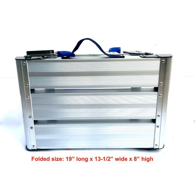 - Platform size is 18"L x 12" W. Overall size is 24-1/2" long x 26" wide x 13-5/16" and collapses to 19"L x 13-1/2"W x 8"H for compact & easy storage