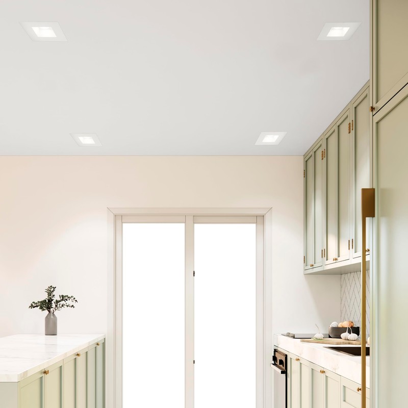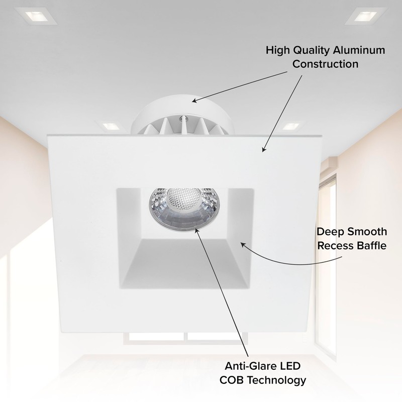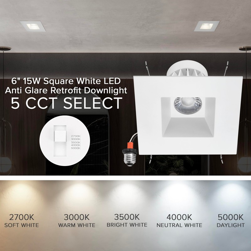 This square anti-glare retrofit LED downlight features a white trim, a deep recess, and a smooth inner baffle. It is a designer trim kit that blends in with most ceilings, creating a clean sleek look. It is dimmable and color selectable with 2700K, 3000K, 3500K, 4000K, and 5000K options, giving you the ability to easily choose your preferred soft white, warm white, bright white, neutral white and daylight color temperature by utilizing the switch on the fixture. This recessed light provides 1300 lumens of light output and has a high CRI rating of 90, producing the most accurate rendering of colors in your room. It uses just 15 watts of energy, equivalent to a 100W incandescent ceiling light. This light is a retrofit LED square downlight that easily installs into an existing can with the provided E-26 quick connect adapter and torsion springs. It is rated for damp locations making it ideal for bathrooms, bedrooms, living rooms, showers, kitchens and more. Featuring a beam spread of 36° this pot light is ETL Listed, and comes with a 3-year warranty.