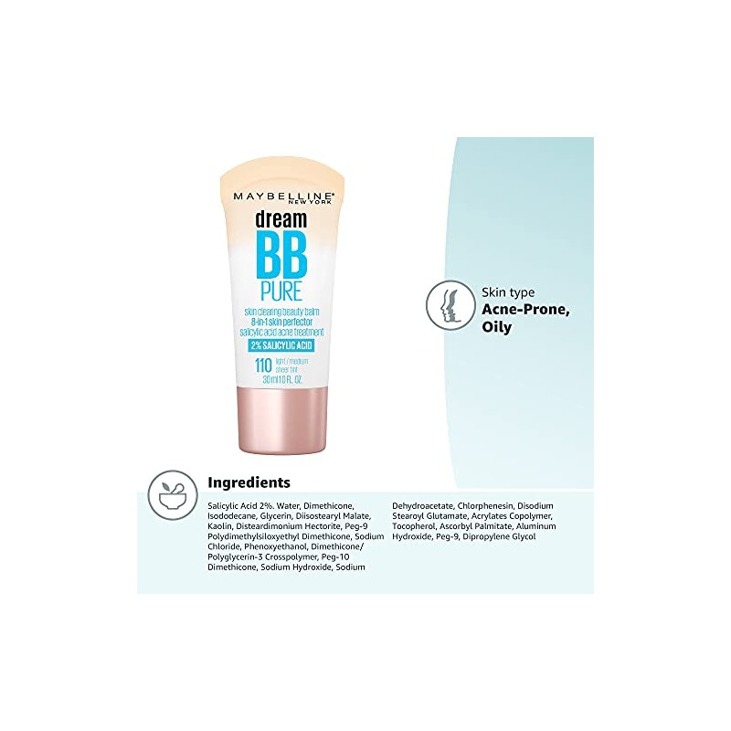 MAYBELLINE Maybelline Dream Pure Skin Clearing BB Cream, 8-in-1 Skin Perfecting Beauty Balm With 2% Salicylic Acid, Sheer Tint Coverage, Oil-Free, Light/Medium, 1 Count