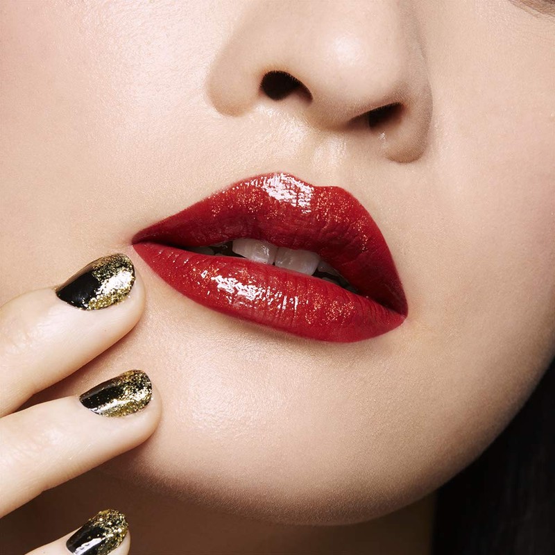 - A glossy lip that can be achieved with a single coat of gloss and color