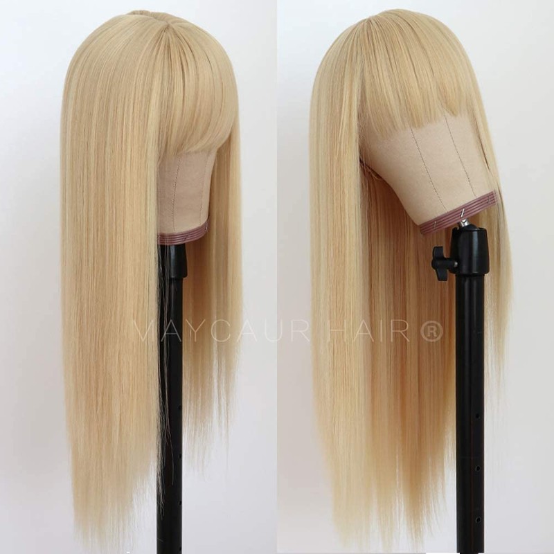 - Maycaur #613 Blonde Synthetic Wigs with Full Bangs & No Lace in Front Full Machine Made.