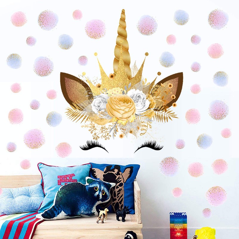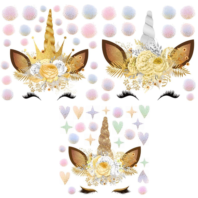 Maydahui 3 Sheets Unicorn Wall Decals 11inch Gold Flowers Wall Sticker Large Horn Ears Eyelash Stickers Dreamy Flash Powder Ball Decal for Gilrs Bedroom Christmas Decoration