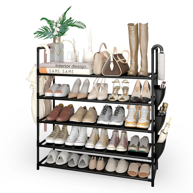 MayDiary 5 Tier Shoe Rack with Side Pocket,Metal Black Shoe Organizer Storage Shelf for 20-25 Pairs,Free Standing Shoe Rack Organizer for Front Door Entryway,Closet,Hallway,Bedroom,Small Spaces