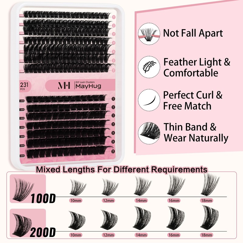 - 【DIY at Home for Your Desired Look】Get 3 styles of mixed cluster lashes to cater to your different makeup looks and moods. Elevate your DIY lashes game with Mayhug lash extensions and take your look to a whole new level.