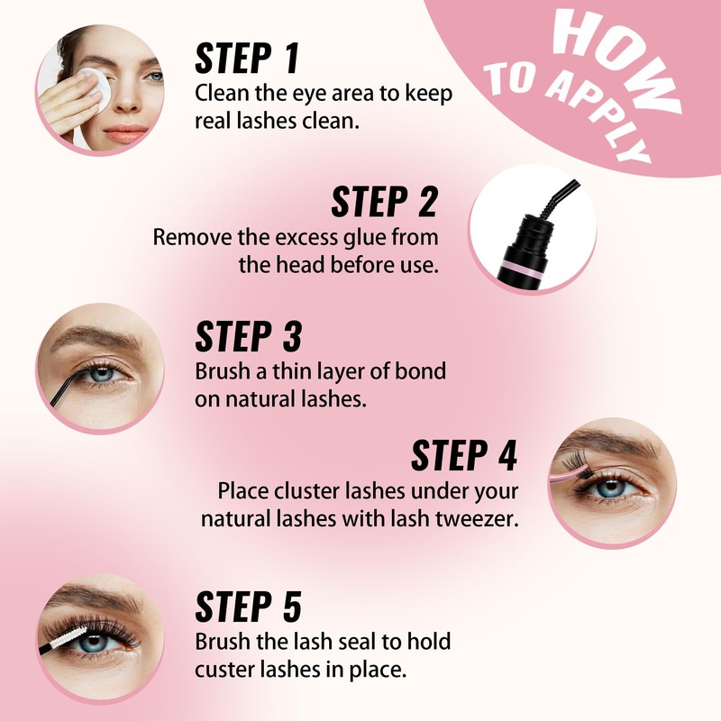 - 【How to Apply DIY Lashes】Gently dab the cluster lash glue on your natural lashes or on the cluster lash band, and then apply the cluster lashes in the way you like. If needed, brush a thin layer of sealer for reinforcement.
