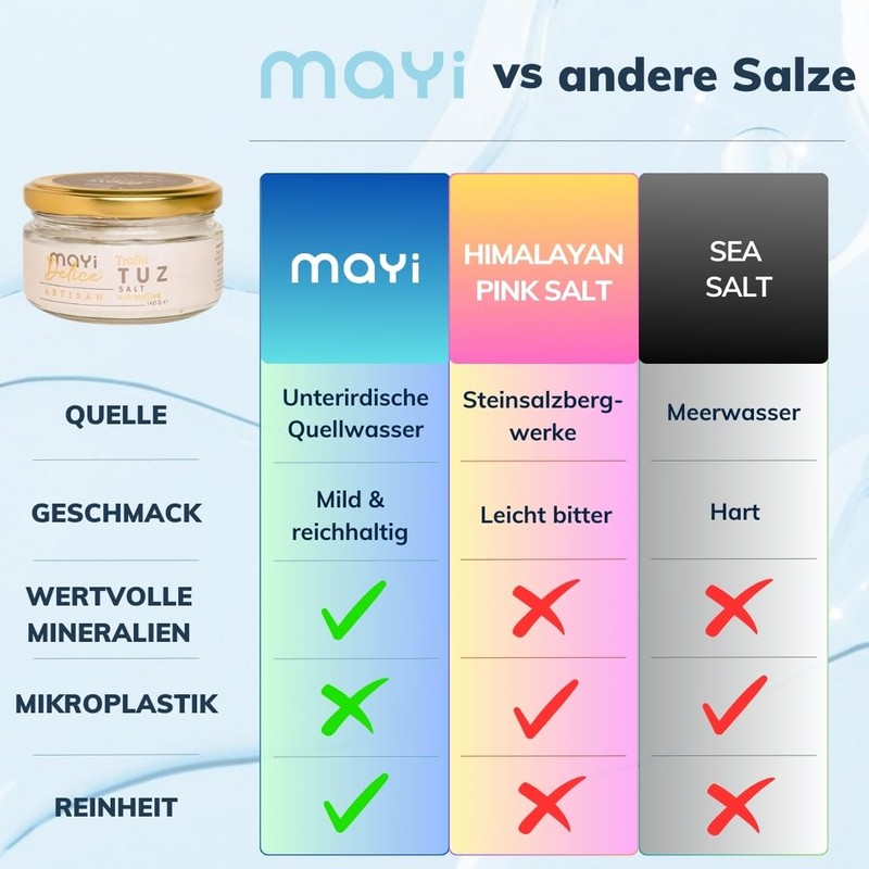 - PURE NATURAL PRODUCT: Our MAYI swelling salt comes from underground salt deposits and is processed without chemical additives. It is completely natural and contains no trickle aids - ideal for a conscious and natural diet.