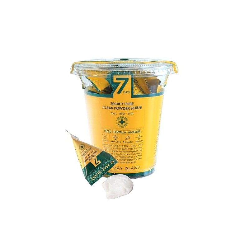 The MAYISLAND 7Secret Pore Clear Powder Scrub is an advanced exfoliating facial scrub designed to deeply cleanse and rejuvenate the skin. With over 40% micro-baking powder particles, it effectively removes blackheads, whiteheads, excess sebum, and impurities lodged deep within pores, while gently sloughing away dead skin cells for a smoother texture. Its formula is powered by AHA, BHA, and PHA—three exfoliating acids that work together to provide multi-layered care. AHA removes surface-level impurities, BHA penetrates pores to dissolve oil and buildup, and PHA gently exfoliates while maintaining hydration, making this scrub suitable for even sensitive skin. Enriched with 200,000ppm of Centella Asiatica extract, it delivers calming and soothing effects, reducing redness and irritation while promoting balanced, healthy-looking skin. Aloe Vera leaf extract further enhances hydration, leaving the skin feeling soft, refreshed, and radiant. The scrub is packaged in innovative single-use triangle pouches, ensuring hygiene and convenience with every application. These compact, travel-friendly pouches make it easy to maintain a thorough skincare routine wherever you are, whether at home or on the go. Ideal for anyone seeking clear, smooth, and bright skin, the 7Secret Pore Clear Powder Scrub combines powerful exfoliation with gentle, skin-soothing care. To use, simply shake the pouch lightly, apply the scrub to wet skin while avoiding the eye and mouth areas, and gently massage in circular motions before rinsing thoroughly with lukewarm water. This easy-to-use scrub is perfect for minimizing the appearance of pores, controlling sebum, and achieving a refreshed, glowing complexion. Designed to deliver total care with exfoliation, hydration, and pore purification, it’s the ultimate solution for maintaining clean and radiant skin.