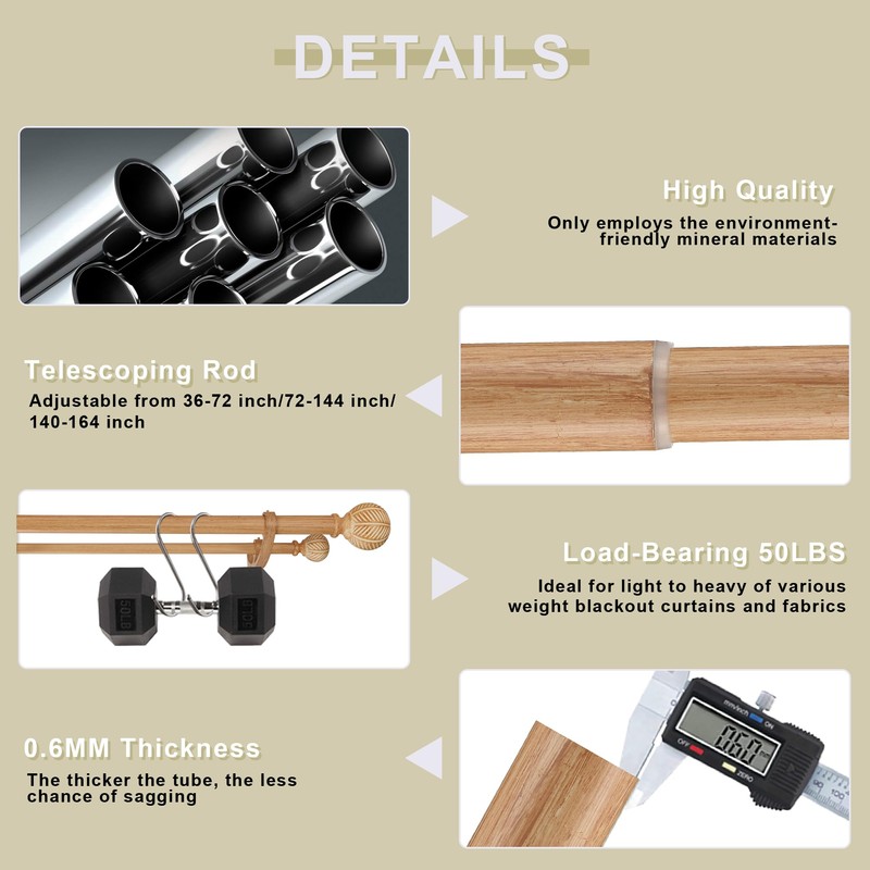 - 【Adjustable Telescopic Rod】- Our wooden curtain rods for windows 72-144 inch (3 size options) ,which can fit 99% of windows. Includes 6 telescopic tubes & 2 finials & 3 brackets, which can easily extend/shorten the length. Please follow our measurement guide for a perfect fit!