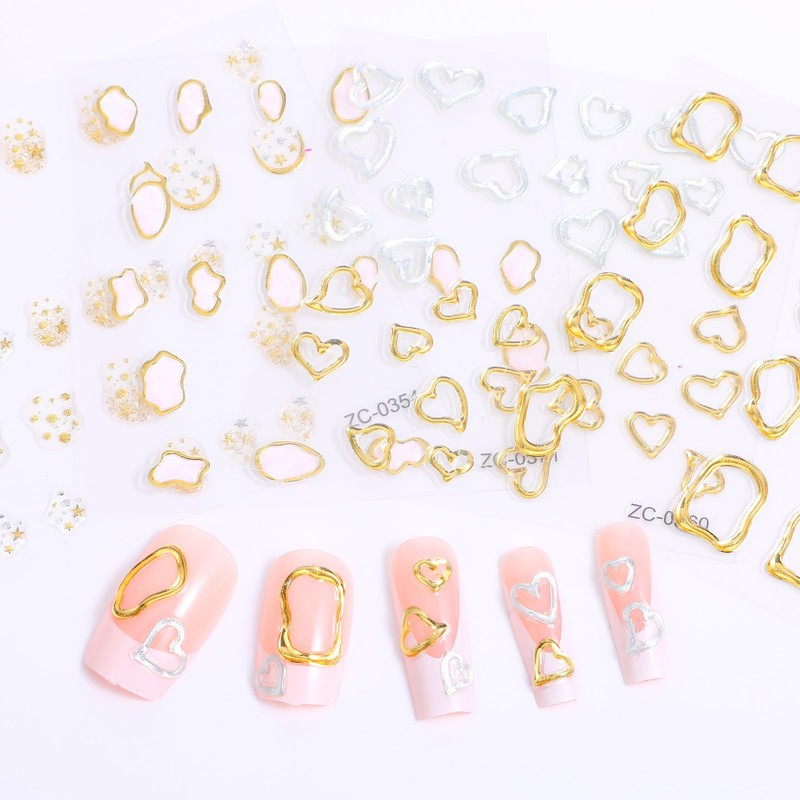 - Rich Patterns: Our soft glue decal set features 4 stylish patterns(gold irregular hollow geometry, white irregular geometric frames, delicate hearts and shining stars.)each pattern comes in multiple sizes, from large stickers for thumbs to small styles for other fingers, to meet the perfect fit needs of different nails