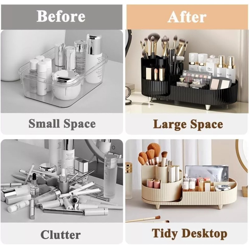 The makeup organizer consists of a combination of left and right areas, the left cylinder can be rotated 360° for storing makeup brushes, eyebrow pencils, lipsticks and mascara brushes. The right side organizes essence, lotion, perfume, hand cream and sunscreen.