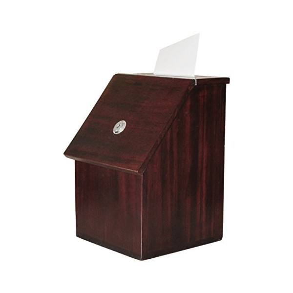 • This mahogany suggestion box is great for donation & charity events. Place a collection bin in an office for employees to contribute for a local cause or at the entrance of fundraising events.A wooden suggestion box is also a great bin for a ballot collection in a school.
