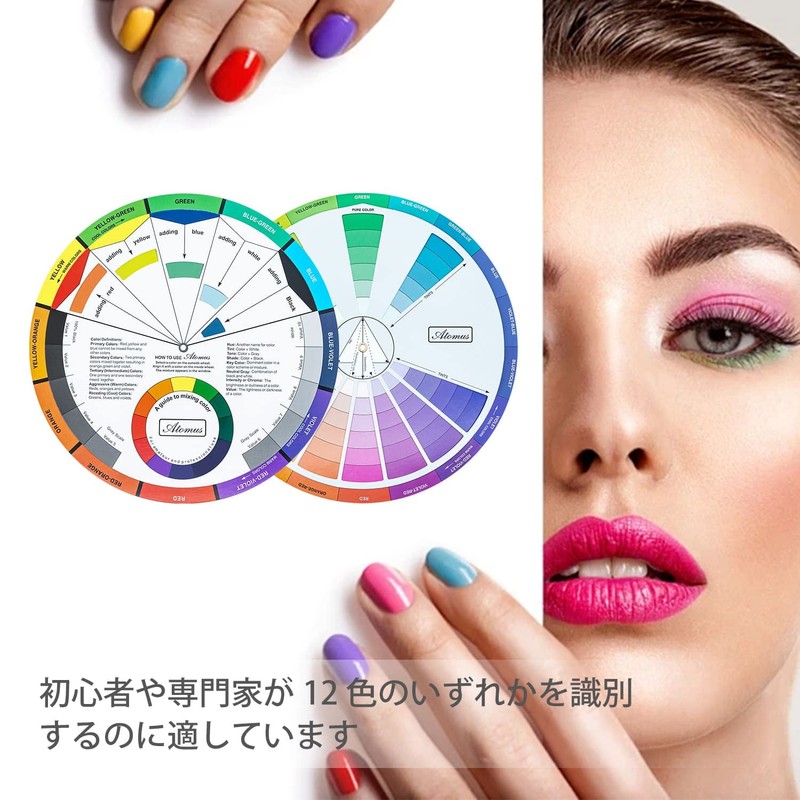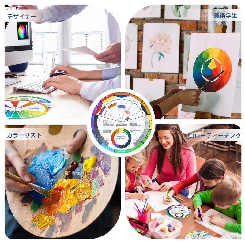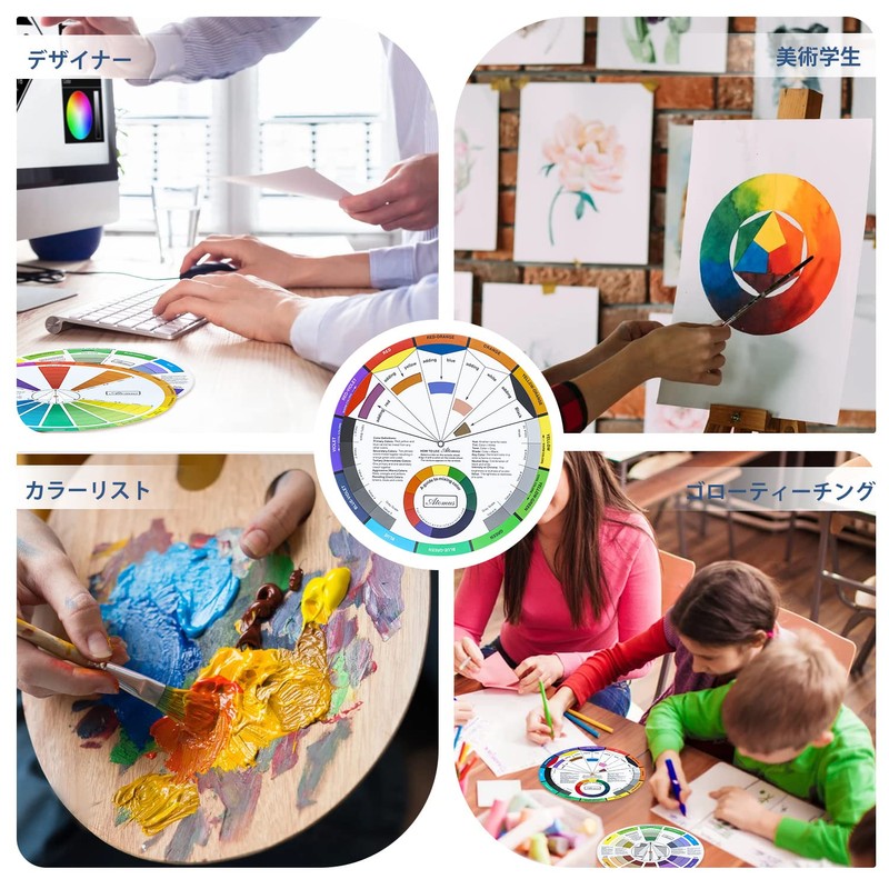 - この360度回転可能なカラーホイールは、色の関係を理解するのに役立ち、選択や組み合わせを簡単にします。