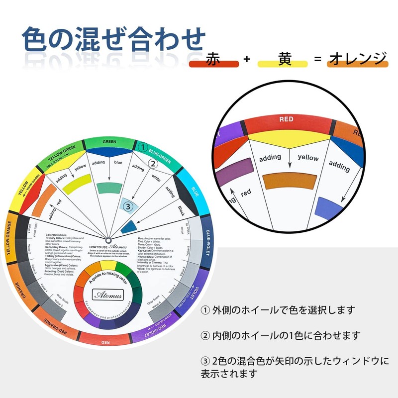 - 【カラーミキシングガイド】カラーホイールの前面には基本原理が示されています。 ホイールを回すだけで、窓に色が混ざった結果が見つかります。 裏面には補完色や トライアドカラーなどの色の関係が表示されています。 創造するときに、より多くの色を組み合わせることができます。