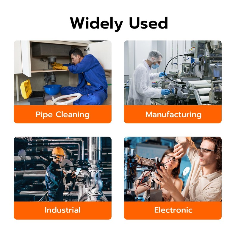 Wide Application: Used for Pipe Cleaning、Marine Manufacturing Industry、Industrial Machinery、Electronics And Electronics Industry. Battery Capacity: Equipped with a built-in 2000mAh large lithium battery capacity, 3.5-4 hours working time, meeting your long-term usage needs.