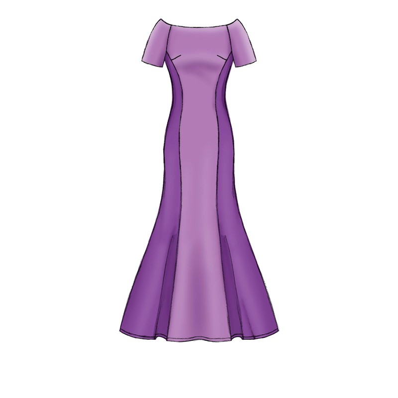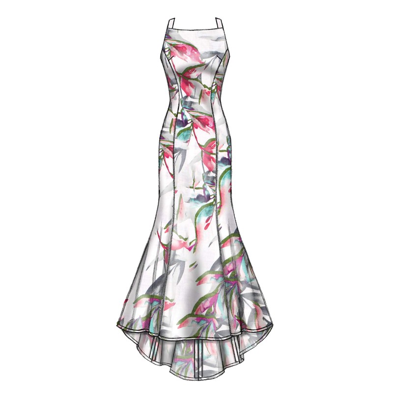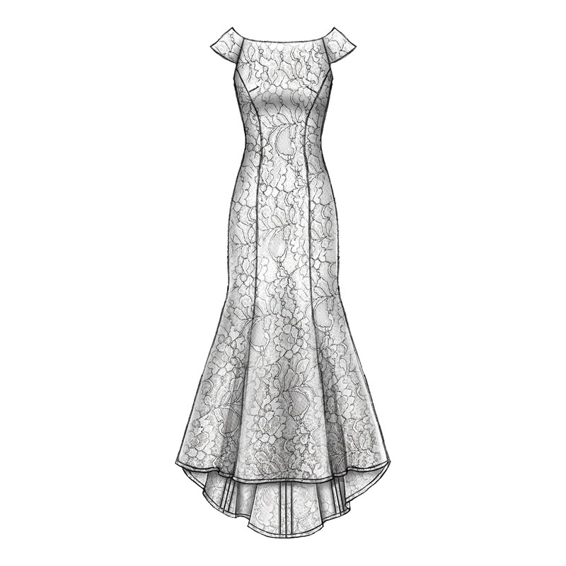 - Lined, floor length dress has a snug chest with stitching, interfaced neckline, side front and side back seams, and an invisible back zip, and can be made with sleeve and hem variations.