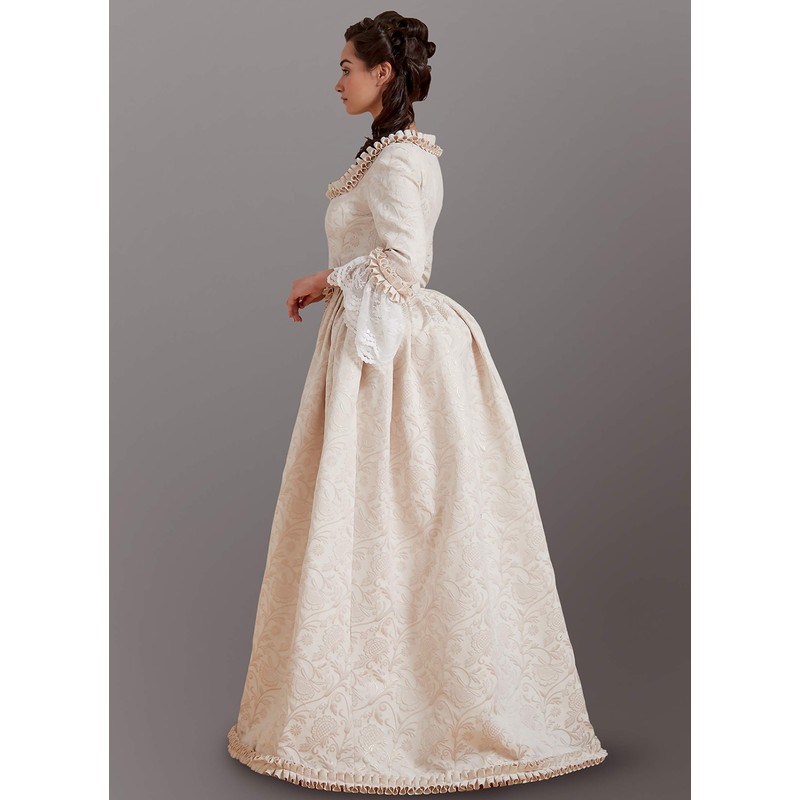 - Snug fitting costume jacket and robe pattern are finished with a lined and underlined bodice, shoulder seams that roll back, hook closure front, bones, two-piece sleeves and contrast lace trim.