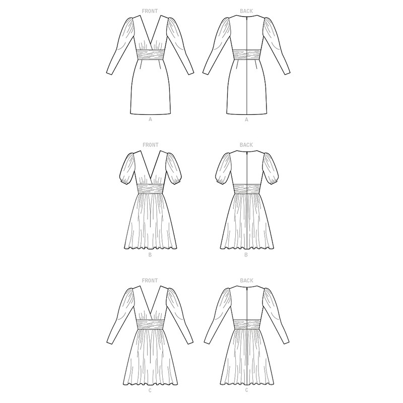 - Women's sewing pattern packet comes with sewing templates, fabric recommendations, pattern pieces, sizing guides, and instructions for (3) dresses.