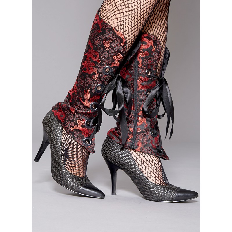 Spat a: lined, with purchased charms and trims. Spat B: lined, with purchased lace and ribbon ties. Spat C: lined, with side zipper opening and front tabs. Spats d: lined, with side zipper opening and purchased ribbon for laced front. Spats e: lined and quilted, with side tabs with Buckles. Spats F: lined, with contrast overlay and ruffles. Views a, B, F have back opening. A, C, contrasts: e, F: leather, embossed lambskin, synthetic leather, ultra suede. B, d: Velveteen, brocade. E, lining e: Ponte knit. F, lining F: Suiting. Also contrast F: embossed goat suede. Lining a, C: pigskin, ultra suede. Lining B: satin. Lining d: brocade. Interfacing B, d: Fusible light weight cotton. Note: fabric requirement allows for Nap, one-way design or shading. Extra fabric may be needed to match design or for shrinkage.