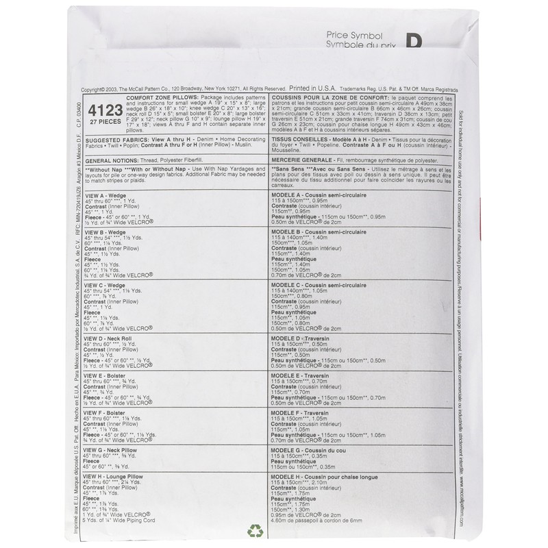 COMFORT ZONE PILLOWS: Package includes patterns and instructions for small wedge A 19-Inch by 15-Inch by 8-Inch; large wedge B 26-Inch by 18-Inch by 10-Inch; knee wedge C 20-Inch by 13-Inch by 16-Inch; neck roll D 15-Inch by 5-Inch; small bolster E 20-Inch by 8-Inch; large bolster F 29-Inch by 12-Inch; neck pillow G 10-Inch by 9-Inch; lounge pillow H 19-Inch by 17-Inch by 18-Inch; views A thru F and H contain separate inner pillows. GENERAL NOTIONS: Thread, Polyester Fiberfill. SUGGESTED FABRICS: View A thru H - Denim, Home Decorating Fabrics, Twill, Poplin; Contrast A thru F or H (Inner Pillow) - Muslin. Without Nap, With or Without Nap - Use With Nap Yardages and layouts for pile or one-way design fabrics. Additional Fabric may be needed to match stripes or plaids.