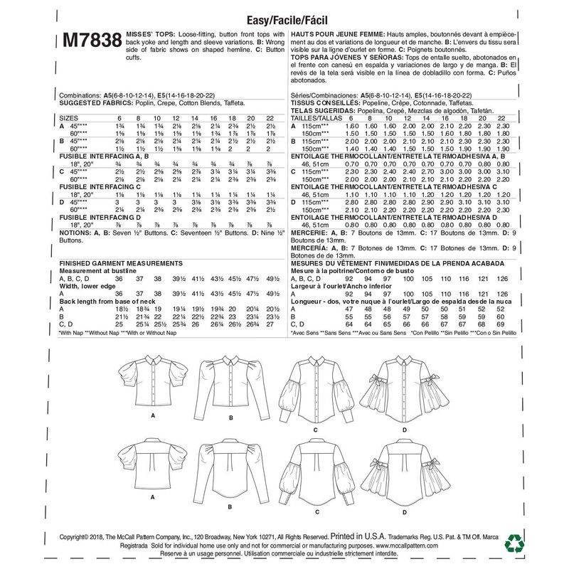 - Proudly designed and printed in the USA, all McCall's sewing patterns include English, Spanish, and French instructions.