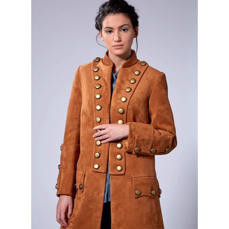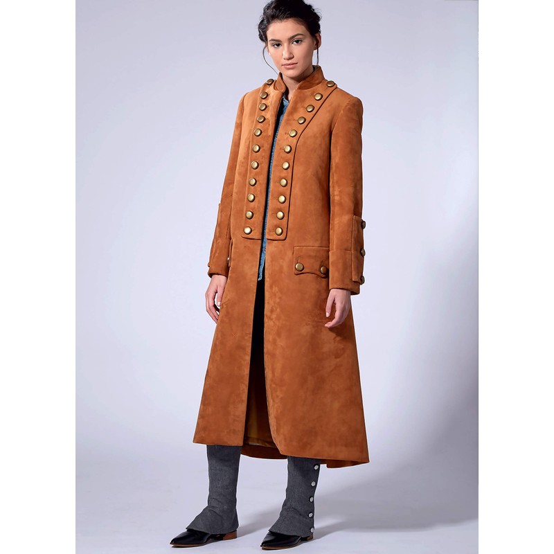 - Coat pattern is fitted through the bust and fully lined with two piece sleeves, button detail on front opening edges and sleeves, while spat pattern is lined and have button details with elastic stirrups.