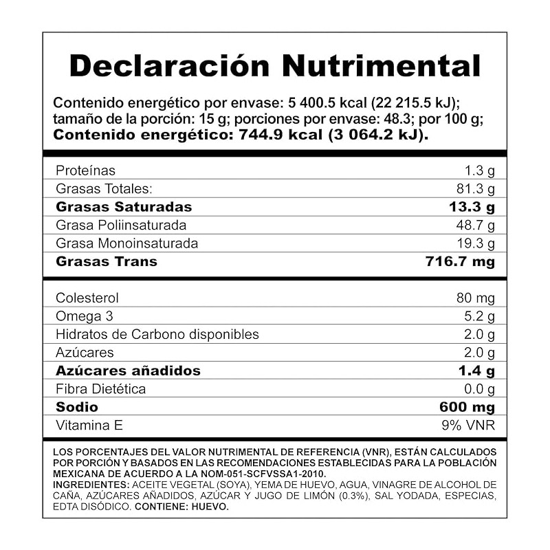 | Ingredientes | Aceite vegetal, soya, yema de huevo, agua, vinagre de alcohol de caña , azúcar, sal yodada, especias, jugo de limón (.3%) y EDTA disódico. |