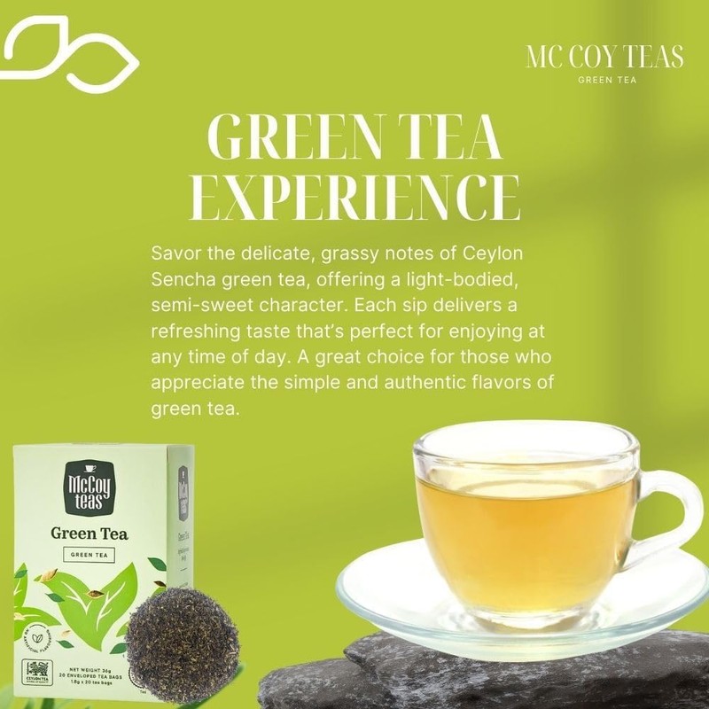 - PURE CEYLON GREEN TEA EXPERIENCE. Enjoy a cup of McCoy Green Tea made from premium Ceylon Sencha leaves. Each sip offers a light-bodied, semi-sweet character with vegetal notes and a soothing olive gold hue. A clean and refreshing addition to your daily tea ritual.
