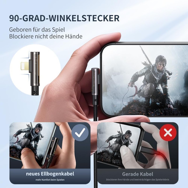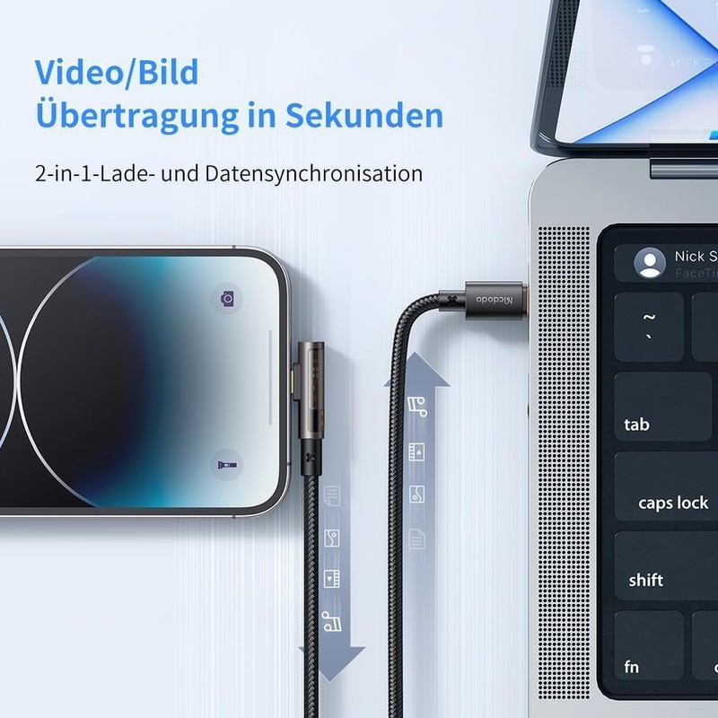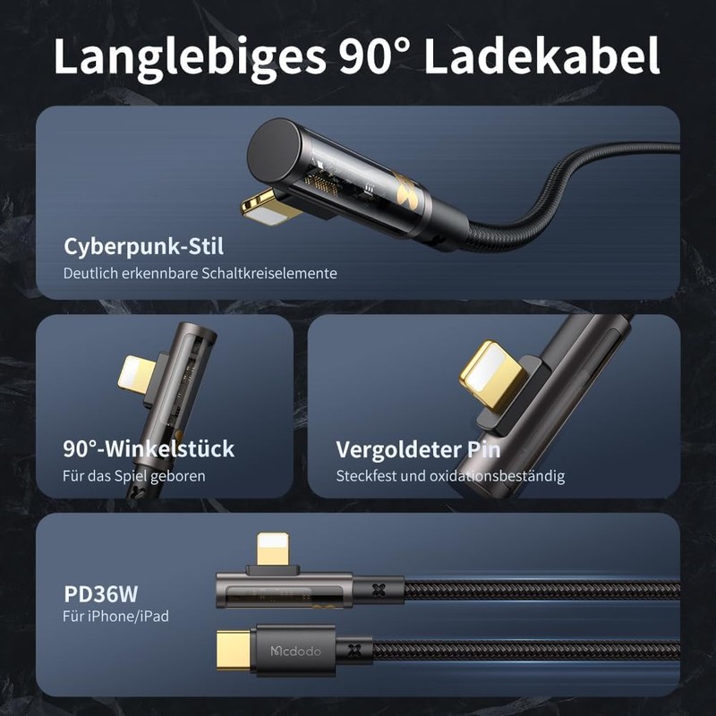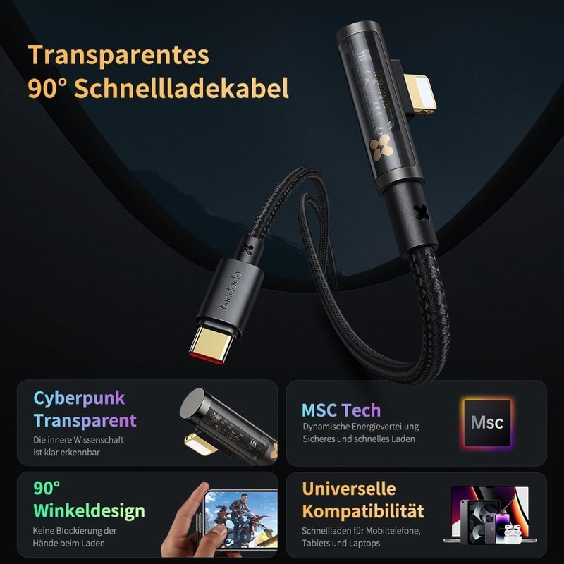 • Mcdodo 36 W Type-C to Lightning 90 degree transparent data cable 1.2 m