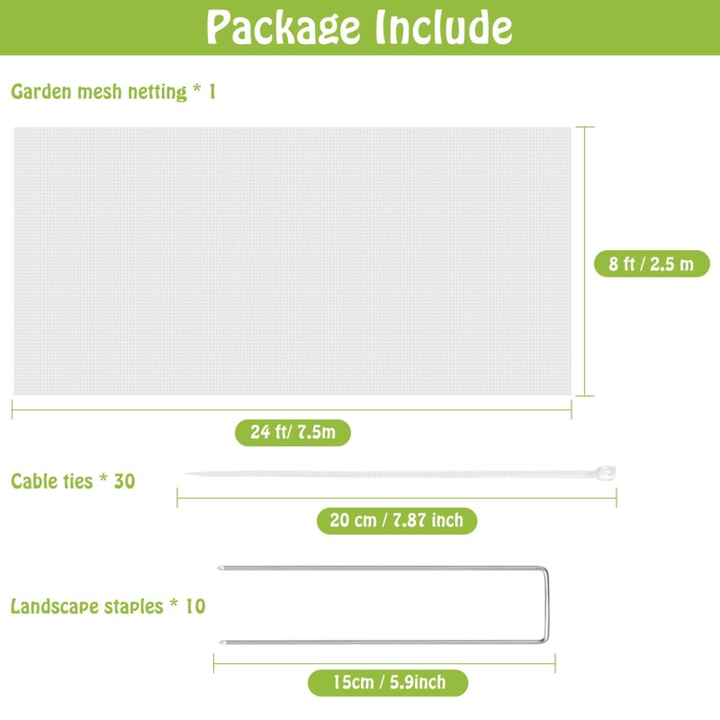 - 【Protect Your Plants from Damage】: Our garden mesh netting adopts a 0.8*1mm ultra-fine mesh design, and the dimensions are 8 ft by 24 ft. It can effectively prevent animals from entering your garden, so you don't have to worry about plants being damaged by them. The Mckanti garden mesh netting allows you to easily harvest fresh and tasty fruits and vegetables.