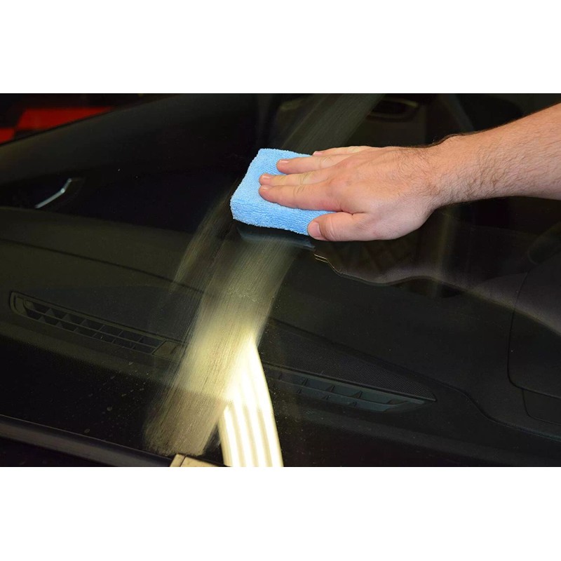 - Rub the product onto the glass in overlapping circular motions. Allow a haze to form. Buff the glass with a microfiber towel.