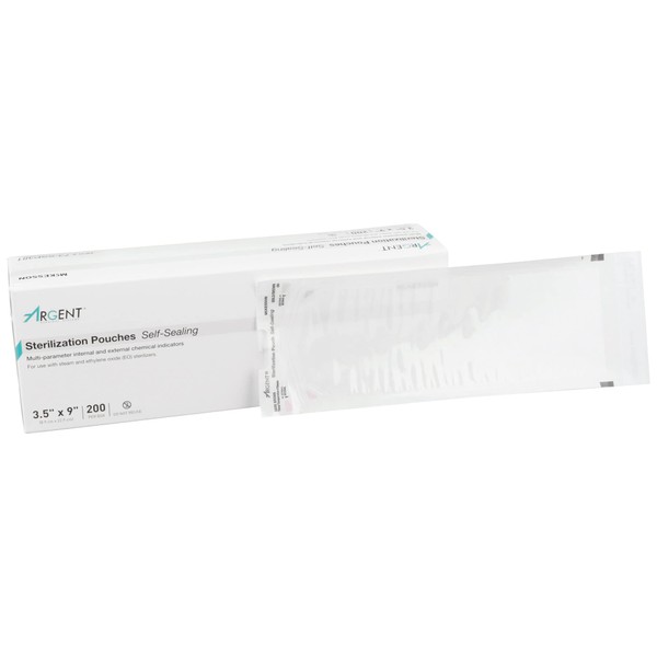 Use McKesson Argent Sure-Check sterilization pouches for instrument sterilization needs in a variety of medical settings. They're made of medical-grade paper/film, transparent/blue in color, and are compatible with ethylene oxide (EO) gas/steam sterilization. Measuring 3 1/2 in x 9 in, these class 4 sterilization pouches have multi-parameter indicators on both inside and outside to make sure of proper saturating steam and EO gas presence, sufficiently high temperatures and adequate exposure time. Designed with triple-sealed secured edges and an extra-wide chevron seal to avoid separation and instrument breaching. They also have a wide self-seal strip and thumb notch to open the pouch easily. Made with transparent film, these steam sterilization pouches make it easier for staff to view the instruments inside.