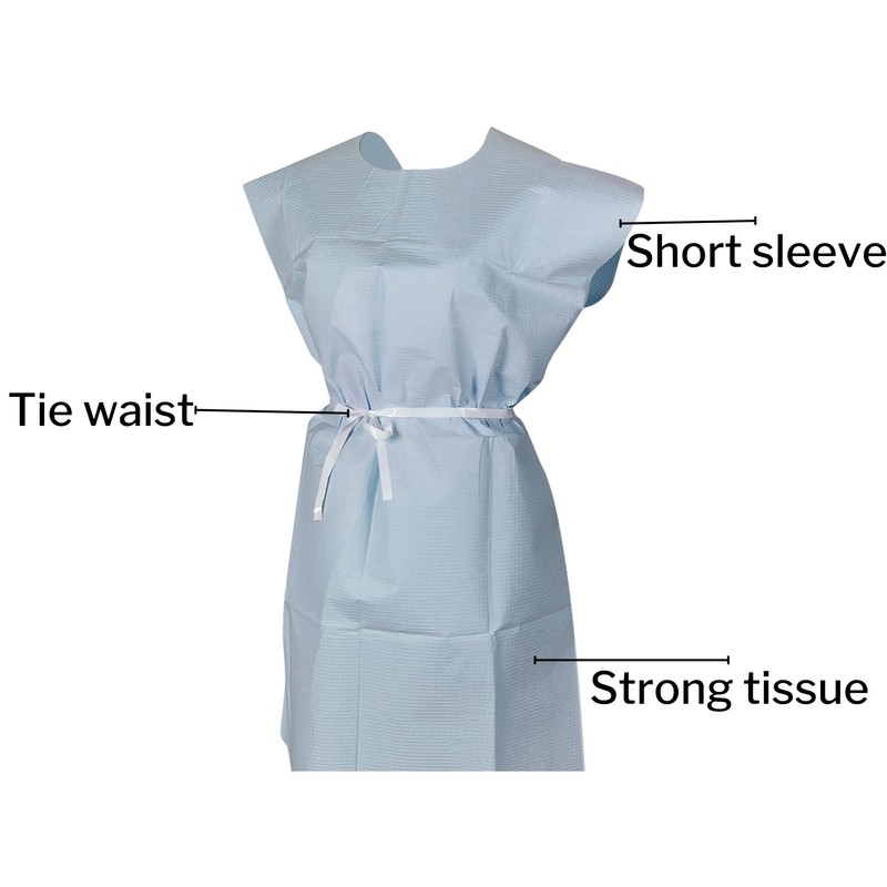 - Features short sleeves and is secured with a waist tie for added comfort; blue disposable design is single-use and not made with natural rubber latex