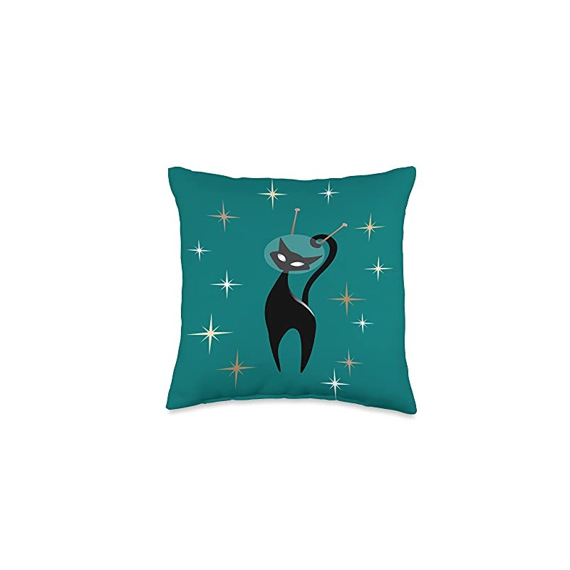 MCM Retro Atomic Mid Century Modern Space Cat Turquoise Throw Pillow