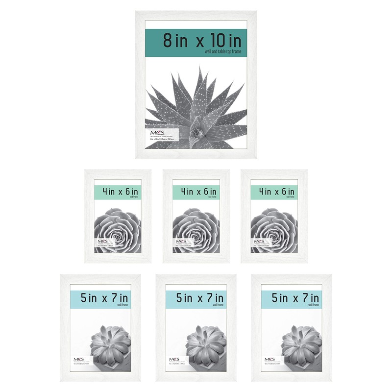 The MCS gallery essential 7 piece frame set is perfect for all of your traditional framing needs. Crafted with a . 75-Inch classic MDF wood frame, The gallery essential perfectly showcases your favorite photographs. The classic White woodgrain finish coordinates with most décor styles. The frames include easy to use turn buttons and slide in back. These versatile frames include an attached easel for tabletop display and sawtooth hangers for vertical or horizontal wall Hanging. Each set includes 3 - 4"x6", 3 - 5"x7" And 2 - 8"x10" Picture frames, ideal for creating a gallery wall.
