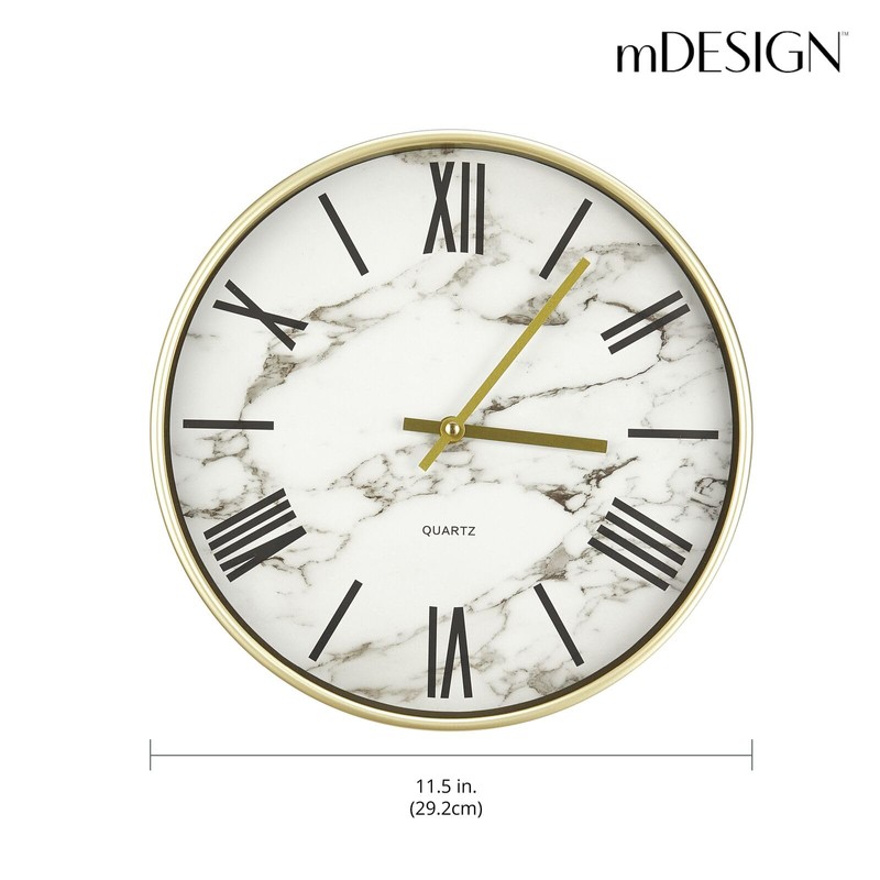 mDesign Modern Stylish Wall Clock for The Office, Bedroom, Kitchen, Bathroom, 11.5 Inch Diameter - Large Black Numbers on a Marble Background with a Clear Glass Cover - Gold Frame and Hands
