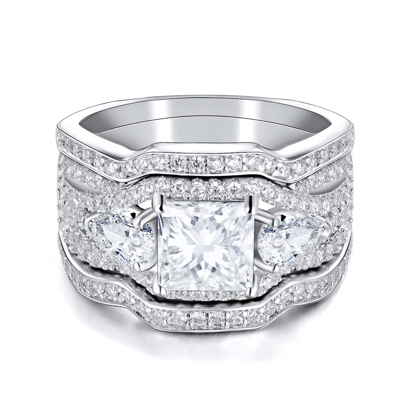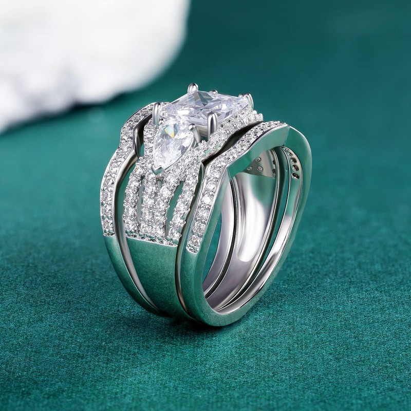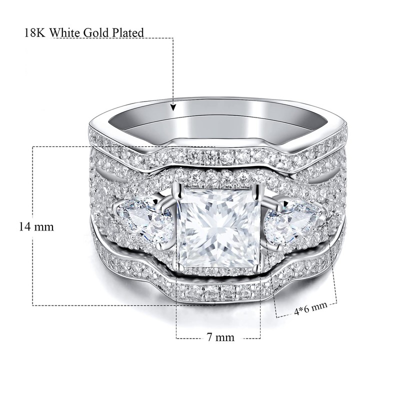 MDFUN Three-In-One Square Wedding Engagement Ring,18K White Gold Plated Cubic Zirconia Promise Eternity Ring for Women (8.5)