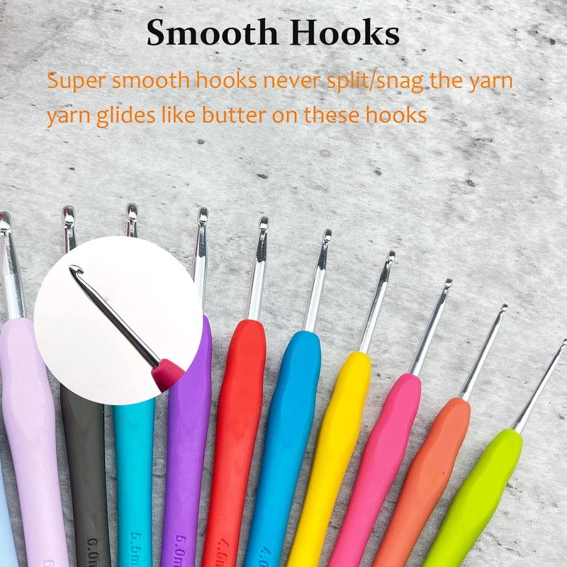 • High Quality Aluminum: The crochet hooks are made from high-quality aluminum,lightweight and durability,Smooth crochet hook glide effortlessly,produce clean finish project and avoid snagging/splitting yarn,crocheting without discomfort.Perfect for arthritic hands who love to crocheting(NOTE:Random Color)