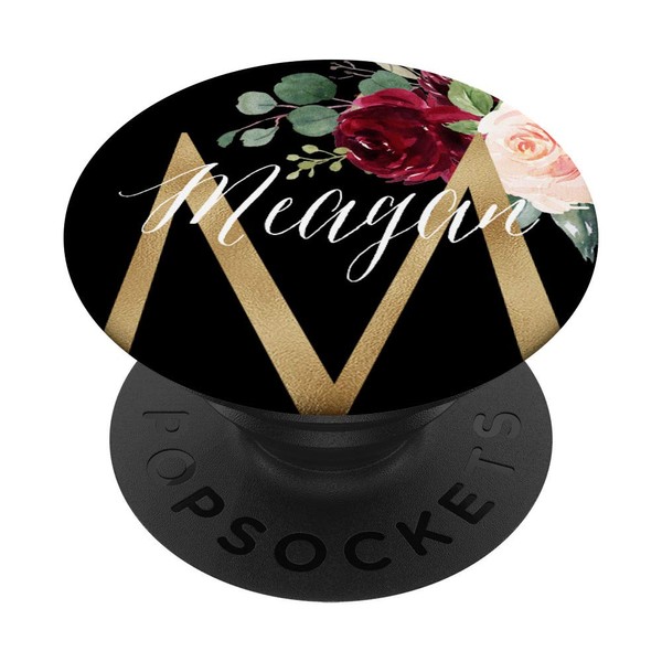 - Perfect gift for any girl named Meagan. Design features name and initial on a black background, adorned with burgundy and pastel peachy pink rose and peony floral bouquet.
