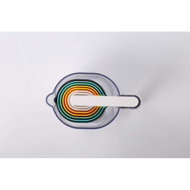 Measuring Cup Set - 9 Pieces - Nested Design - Multiple Components - Angled Surface - Minimal Storage Space - Measures Multiple Components - Read Measures from Above. 1L Cup, 1 Scraper, 6 Spoons