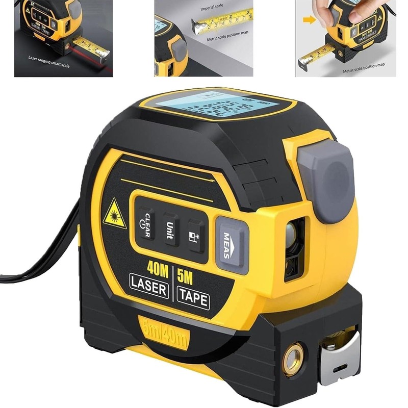 - 3 IN 1 TOOL: Our premium 3 in 1 infrared distance measurer includes a distance measurer, a 5m tape measure, and a cross marking tool. Effortlessly measure high ceilings and other hard to get areas with just one click of a button.