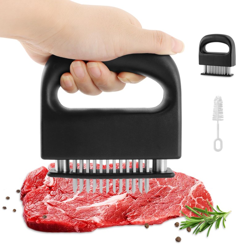 【PACKAGE CONTENT】You will receive 1pc black 48-pin stainless steel meat tenderizer tool and 1pc white cleaning brush. Flexible nylon bristle cleaning brush helps you clean the meat tenderizer tool easily, also can be used on bottles, cups and other items.