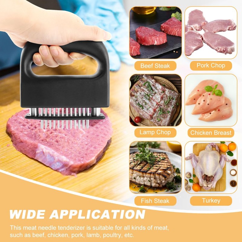 - 【PREMIUM PRODUCTS】Meat tenderizer tool of 48 food-grade sharp needle blades,can easily penetrate the thick meat without stuck and breaking down the knotted tissue for tenderizing,maintaining the original shape of the meat pieces, allowing marinating seasonings to be tasty. The absorption of marinade will increase and cooking time will reduce than traditional pounding mallet or forks.Turn tough meat more juicer and tender.