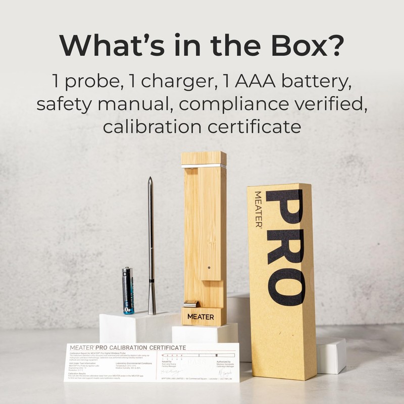 - Accuracy: lab tested through a 3-point calibration process, the sensors are ±0.5°F, and each MEATER Pro comes with a Certificate of Calibration. No calibration or maintenance required.